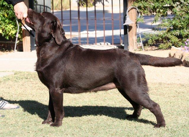 Karma is our house comedian, thief and space invader. A well built girl, sound structure, good movement, square, good bone with a heavy dark chocolate coat. She's moderate to average size (68 lbs) with a gentle personality, feminine and flirty. She lives to entertain and on occasion tries to talk like a human. Special thanks to Tom & Gail Shearer of Bonaventure Labradors for this wonderful girl